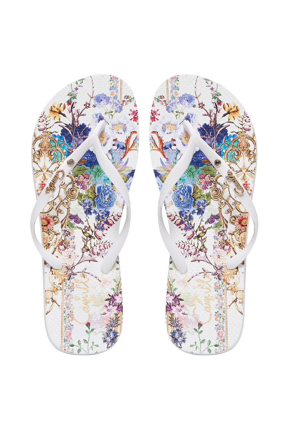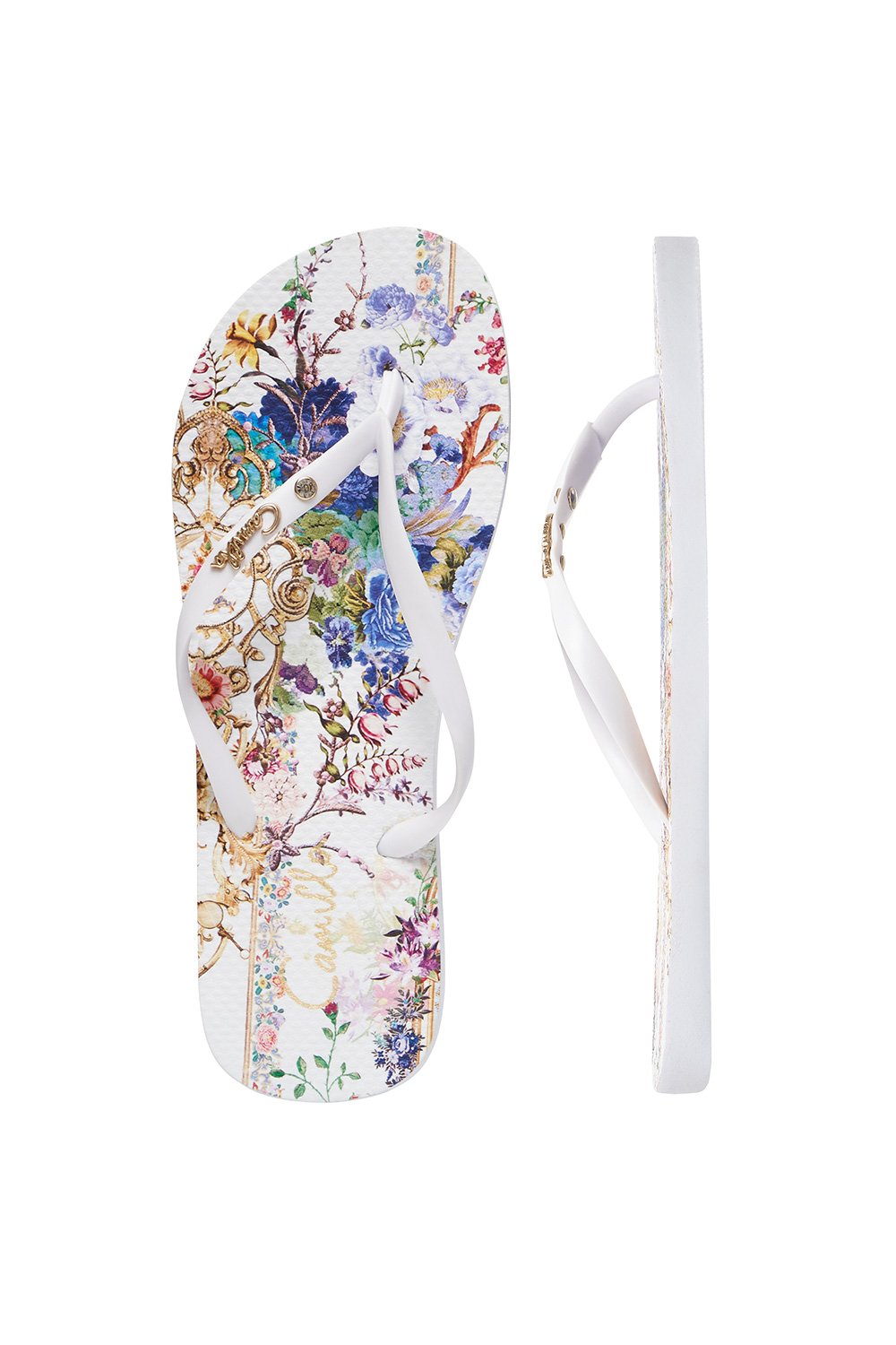 Embodying the essence of summer, the By The Meadow Thong is a beach ready style printed with a luxurious floral scene inspired by an English country garden party. Bright flowers and gilded foliage decorate the rubber soles of these beautiful flip flops, whilst CAMILLA crystal embellishment accent the straps. Pair back with matching resort silhouettes from the By The Meadow collection for a head to toe floral look.