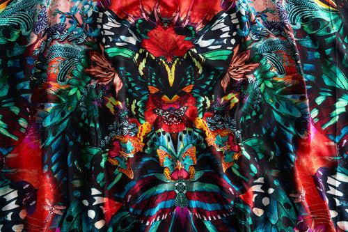 Vibrant swimwear designed with Mother Earth in mind, the In A Flutter V High Leg Pant is encased in a rich sunset hue adorned with cascades of gemstone-toned butterflies, sky blue botanicals, ethereal wing mosaics