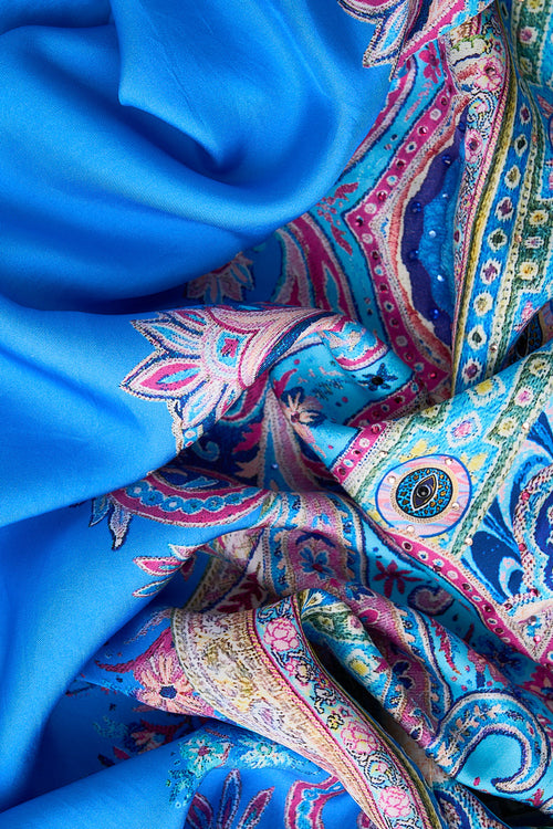 The Footsteps In Folklore Deep V Neck Hardware Kaftan is a handcrafted silk silhouette designed by our in house artisans. Reimagined in an exclusive limited edition print, our longline kaftan exhibits a dramatic plunging V