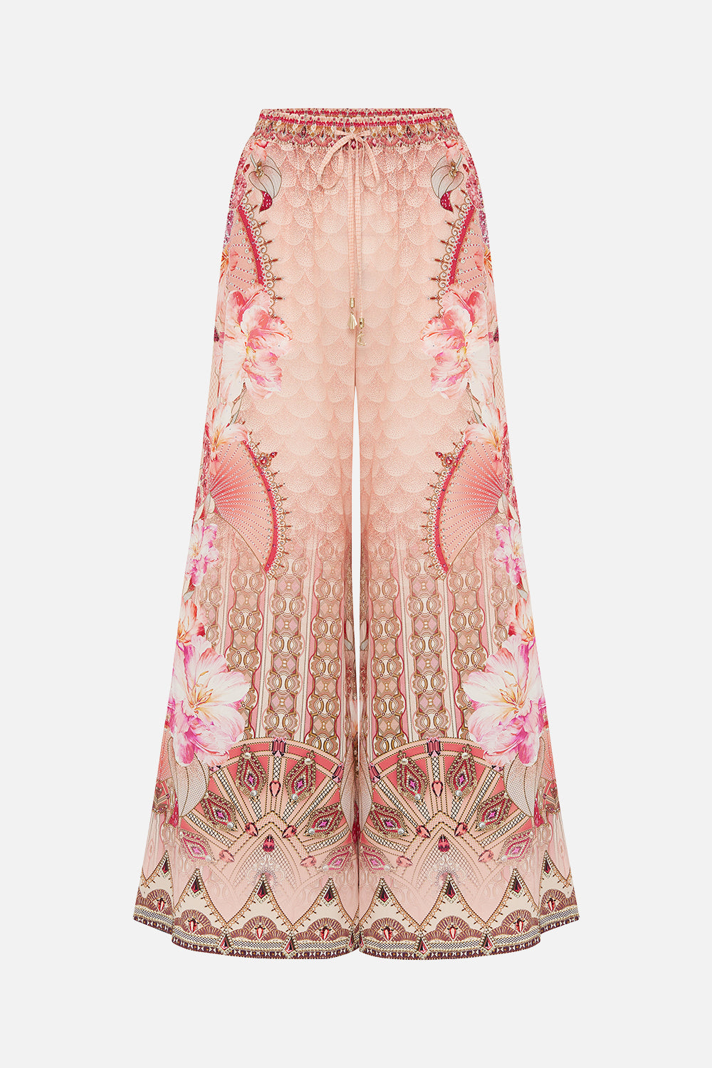 The Adore Me Lounge Pant embodies an arrangement of soft pink blooms set against delicate unfurling fans of pretty pearls and sparkling jewels. Crafted from lavishly soft silk, this luxury palazzo pant plays host to