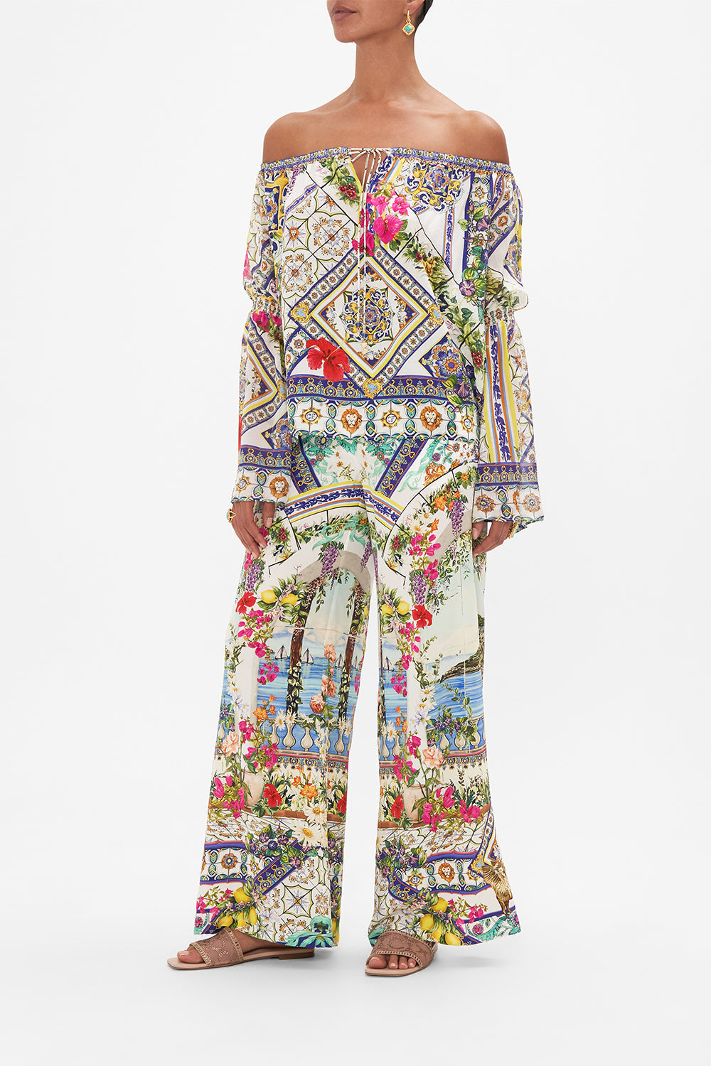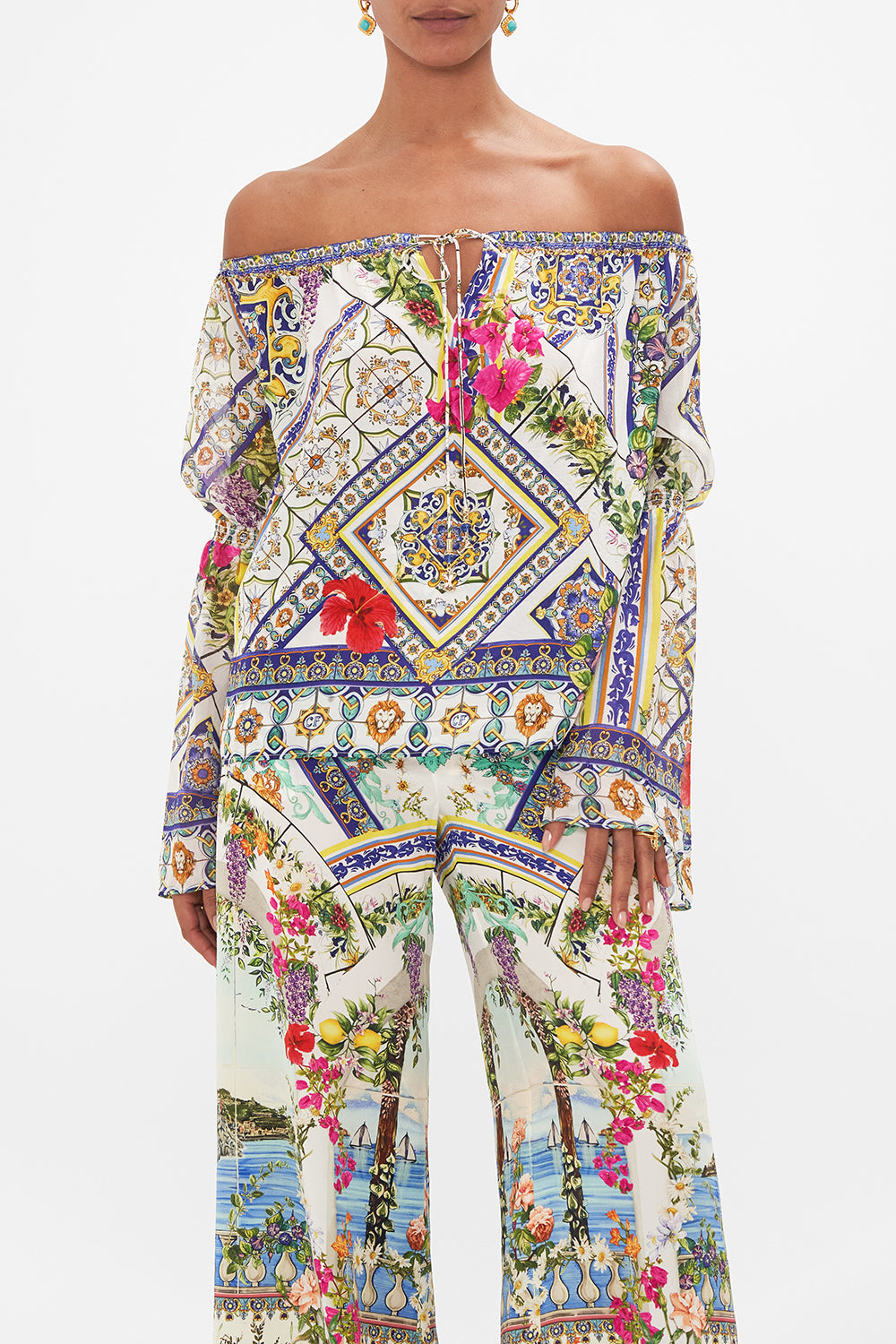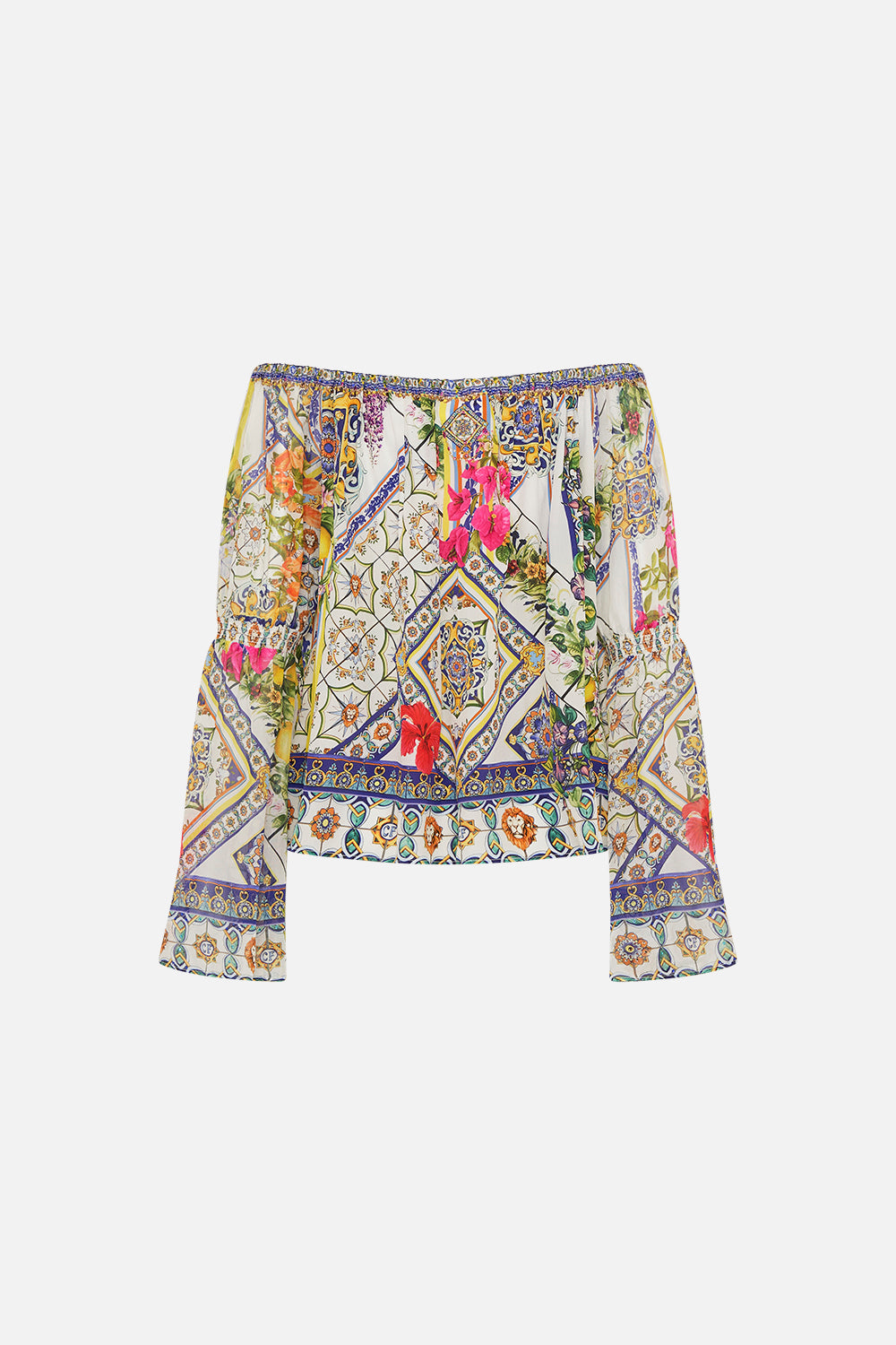 The Amalfi Amore Drop Shoulder Bell Sleeve Top celebrates the vista views through iconic archways lined with fragrant florals at the Hotel Santa Caterina. This luxury CAMILLA silk off the shoulder top features a full