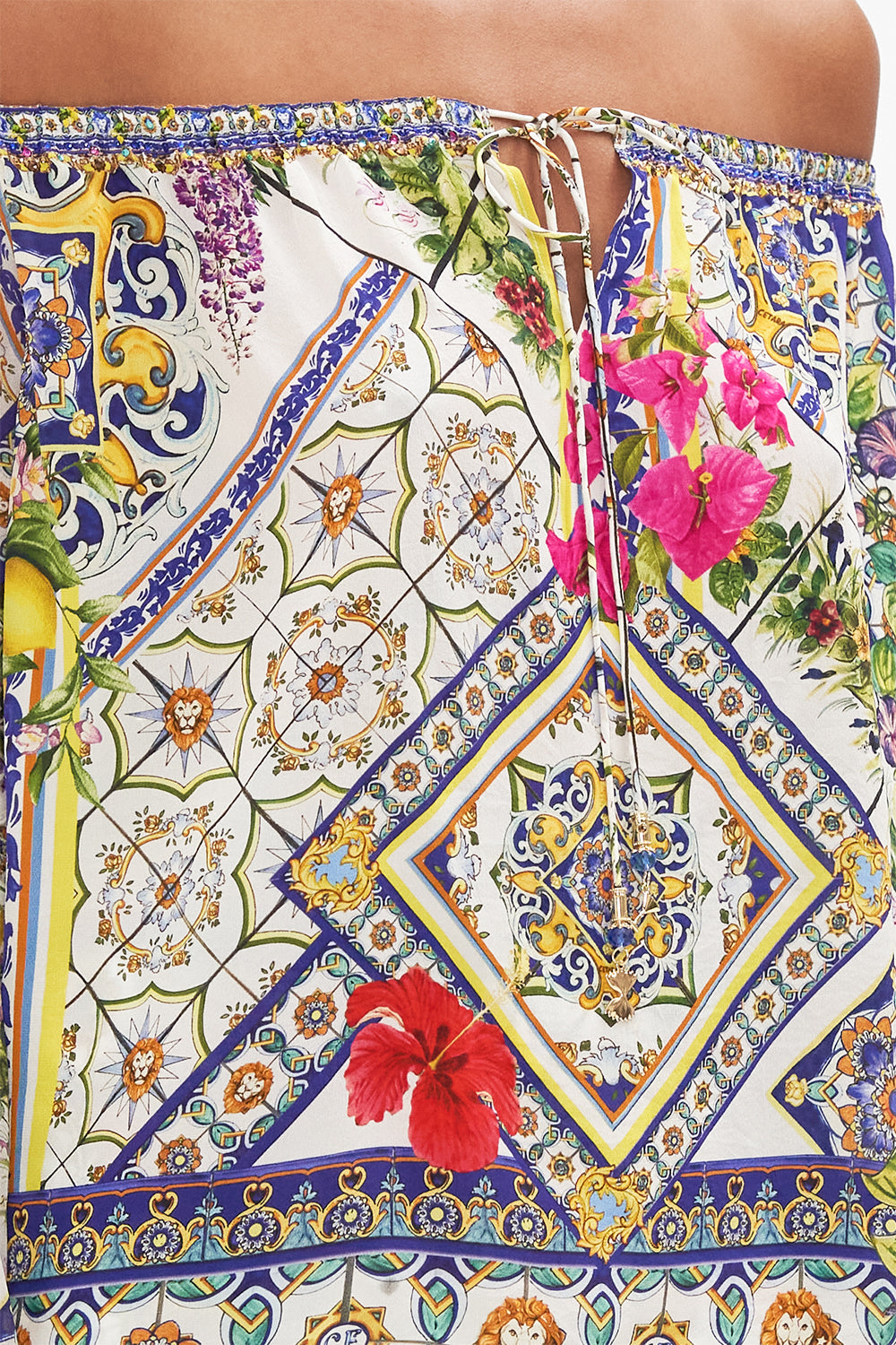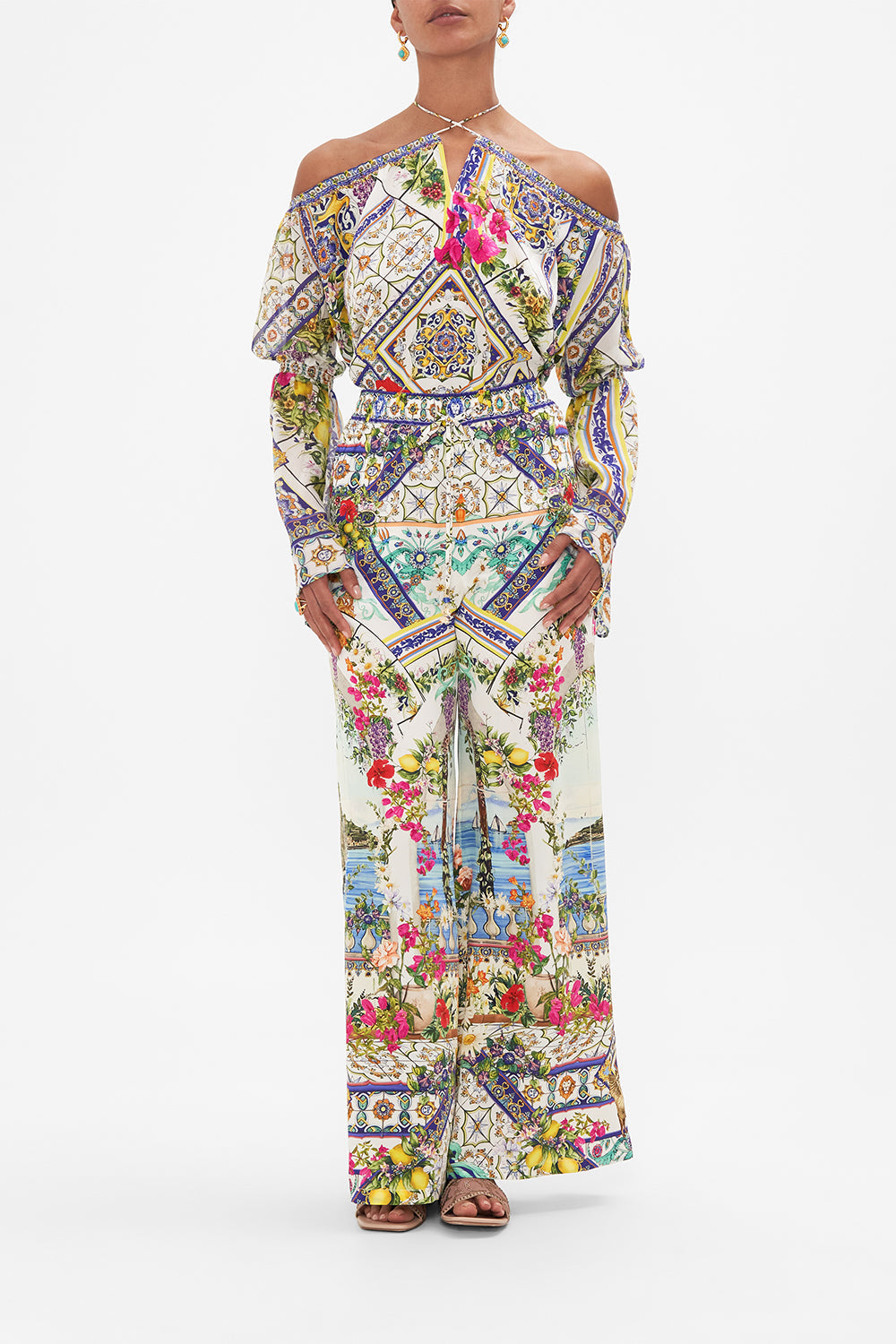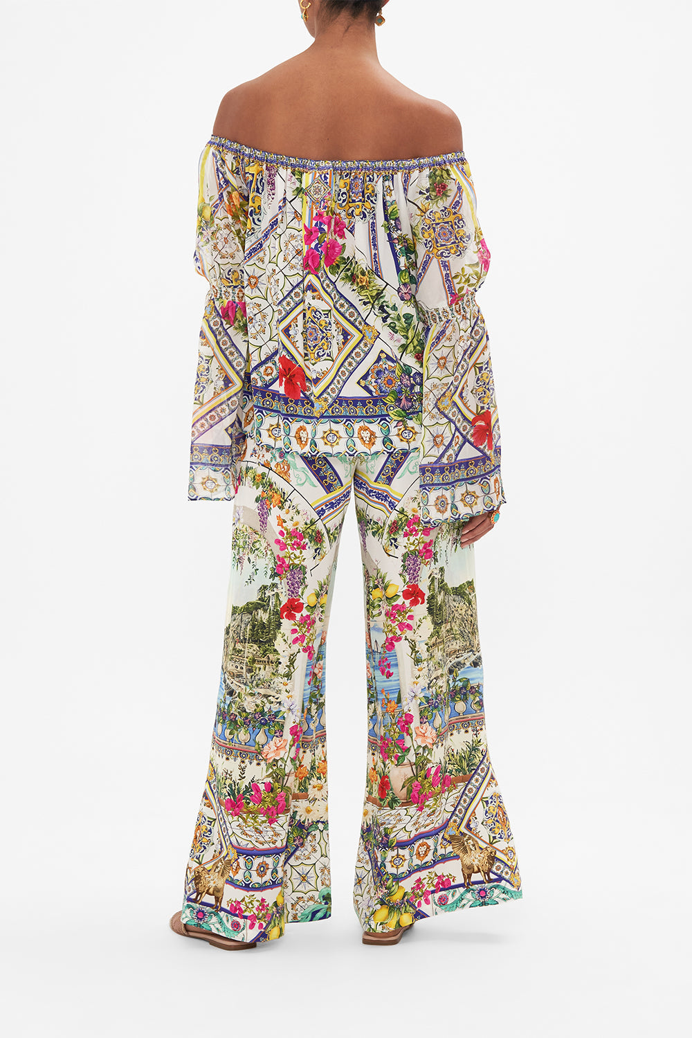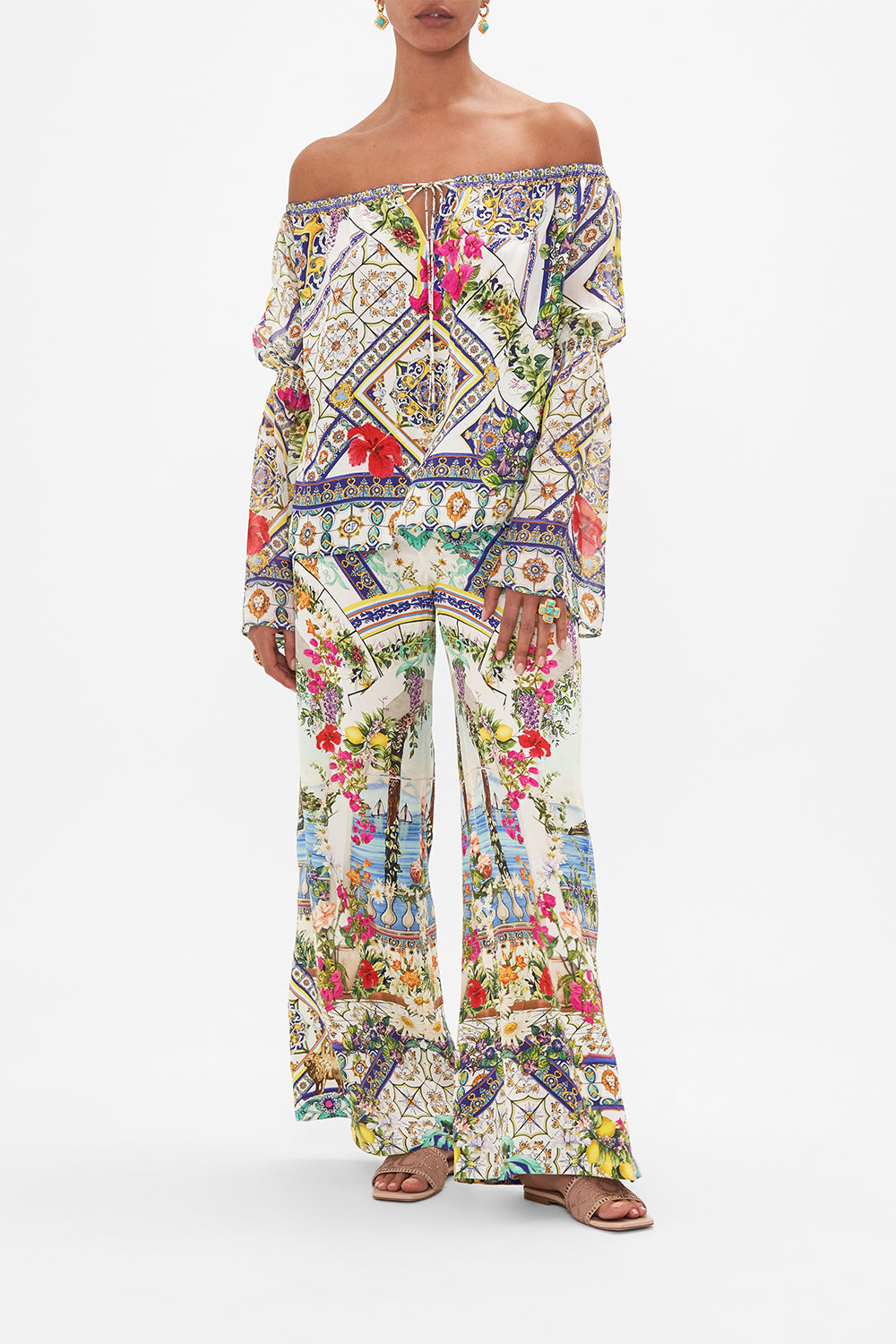 The Amalfi Amore Drop Shoulder Bell Sleeve Top celebrates the vista views through iconic archways lined with fragrant florals at the Hotel Santa Caterina. This luxury CAMILLA silk off the shoulder top features a full