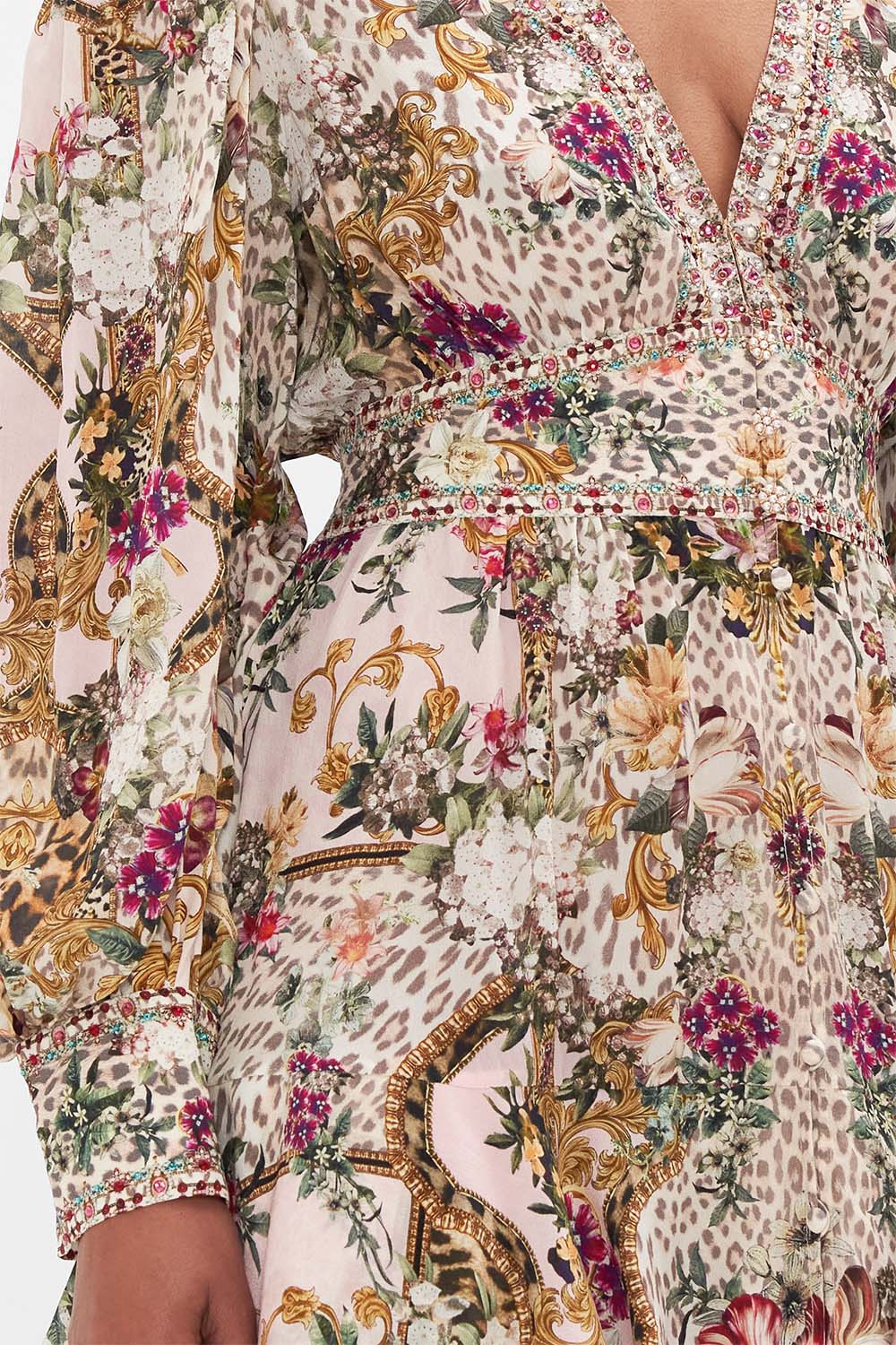 The Bambino Bliss Button Front Frill Dress echoes the sweet symphony pastel pinks awashed in opulent florals and leopard print dancing beneath gilded archways. Complete with crystal embellishments, this luxury CAMILLA mini dress is home
