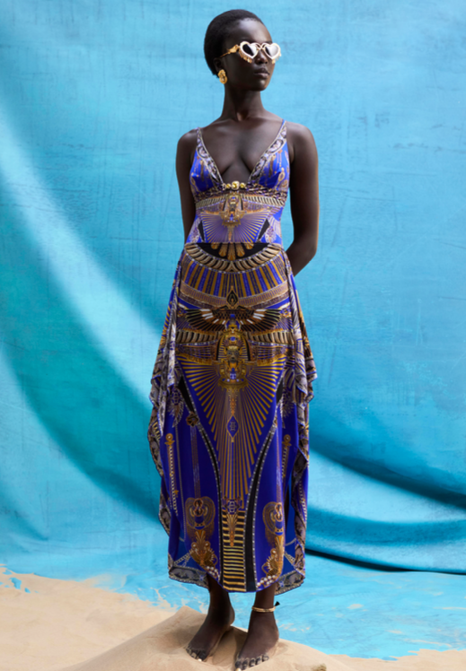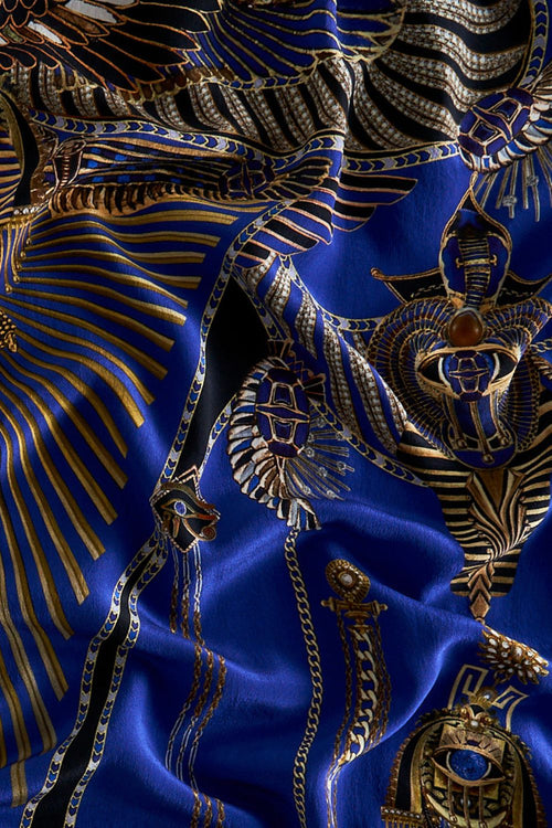 My Fair Pharaoh Gathered Jersey Long Dress captures the intricate gilded artworks of ancient Egyptian gods and goddesses that shimmer against a regal blue. A luxury jersey maxi dress that features a streamlined slim fit