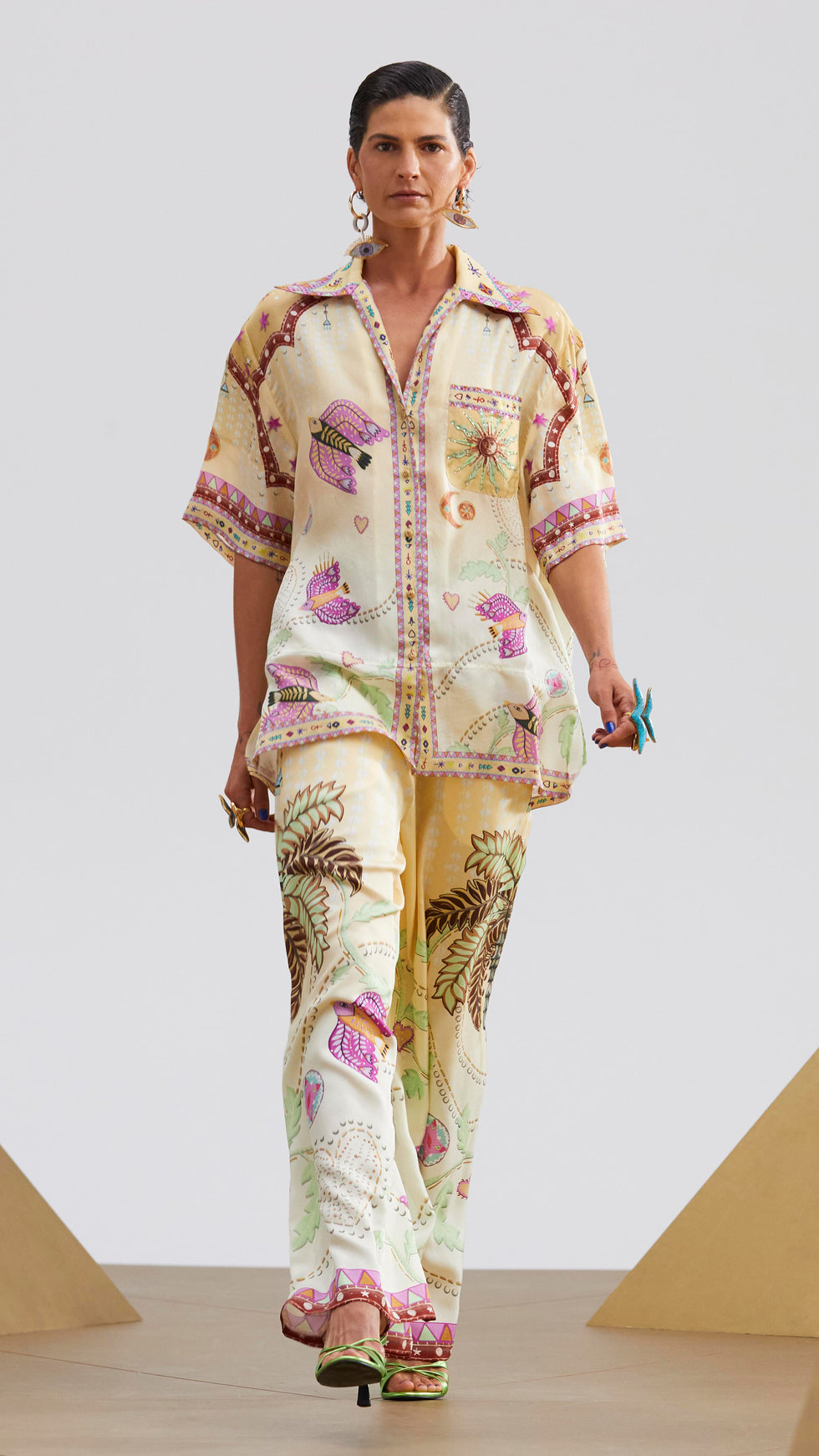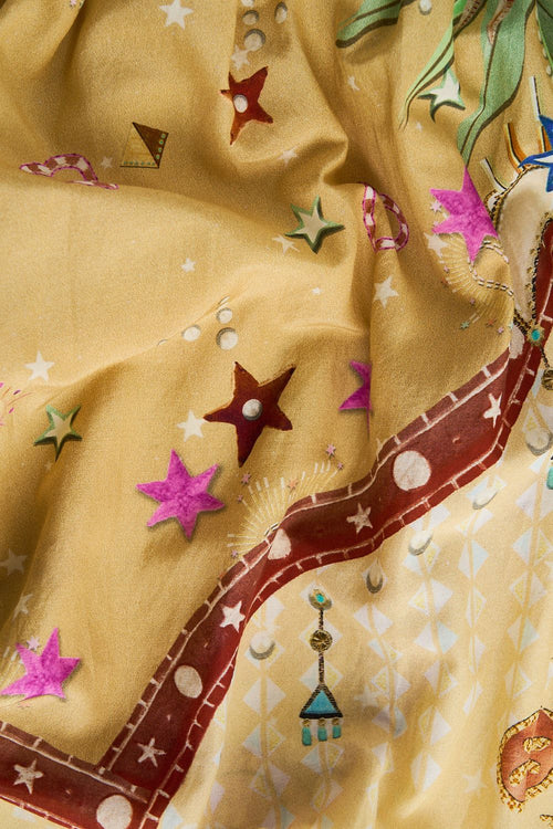 Designed in Australia, The Aswan Abstract Oversized Shirt With Pocket is a love story of traditional handicrafts and hand painted camels, crescent moons, and palm fronds, embedded in exquisite architectural borders. Lovingly handcrafted, this CAMILLA silk shirt features a relaxed fit throughout the body and is adorned with effortless half sleeves that fall to elbow length.