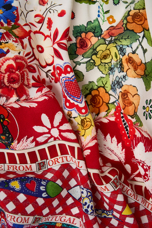 Designed in Australia, The Faith, Luck & Justice Tuck Front Short draws you into the heart of Portuguese folklore—where the Barcelos Cockerel and vibrant fish motifs dance among colourful blooms and kitchy textiles, capturing market