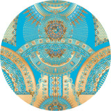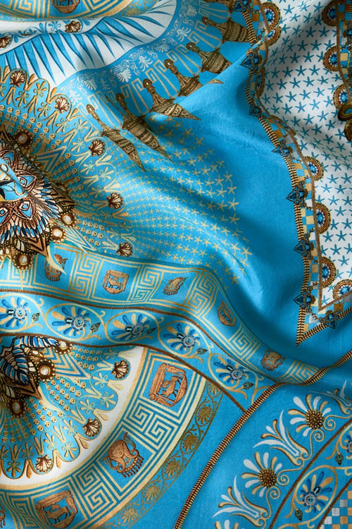 Designed in Australia, The Temple Of Light Collared Button Through Dress unearths the opulence of Dendera and Hatshepsut’s divine legacy. Adorned with celestial motifs and majestic gold arches against a radiant aqua backdrop. Lovingly handcrafted,