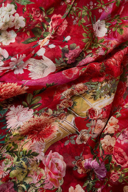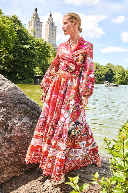 Designed in Australia, The Sweet Home Alexandria Frill Sleeve Long Dress vibrantly emulates the spirit of everlasting elegance and coastal serenity with tumbling florals and golden filigree intwined in sumptuous scarlet red. Lovingly handcrafted, this
