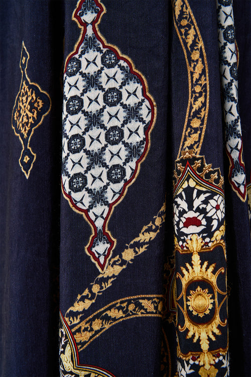 The The Imperial Gate Plunge Neck Draped Shoulder Dress is a handcrafted silk silhouette designed by our in house artisans. Reimagined in an exclusive limited edition print, our draped shoulder dress features a decadent velvet bodice framed by a flattering V neckline. Its elevated with exposed shoulder detail for subtle allure and finished with intricate hand beaded embellishments.
