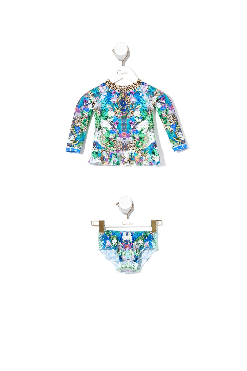 A swimmer set for earth angel babies, the Moon Garden Baby’s Rashie Set is rich with a lush scene of botanical greens and blues. Crafted in a printed CAMILLA Italian Nylon, this cute-as-can-be two-piece swimmer set features a long sleeve for added sun protection and a feminine frill hem. Our digitally printed Italian Nylon Elastane with crystal detail retains colour & shape beautifully, dries quickly and has a high resistance to suntan creams, saltwater and chlorine. To care for your CAMILLA swim piece, simply cold hand wash.