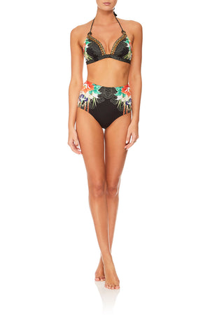 Unveiling opulent threads steeped in layers of history, the Queen Of Kings Belted High Waist Bikini features an adjustable halter top and flattering high-rise pant adorned with Japan's breathtaking floral bouquets. Accented with intricate line-work