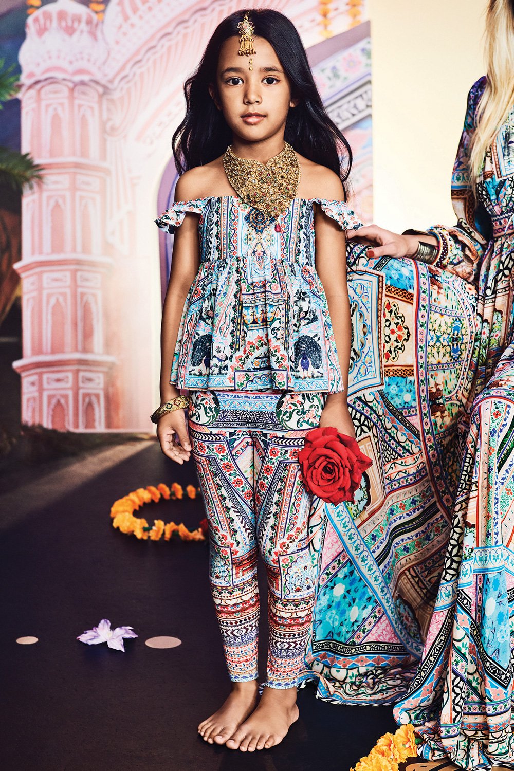 Designed with creative little adventurers in mind, the Everlasting Light Kids Leggings are Camilla's magical tribute to the artist's playground of Udaipur, India. Made from a super soft stretch fabric with a scattering of crystals, these whimsical printed leggings feature exotic tales of Indian folklore in a playful pattern of wild peacocks and stately elephants ideal for free-spirited bohemian babes.