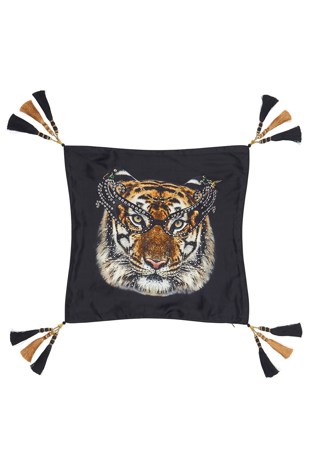 Charmed by the flair of our iconic Dame, the Small Square Cushion proudly exudes personality. This silk pillow boasts tassels on each corner, a playful tiger motif, contrast piped edge, as well as hand-placed crystals